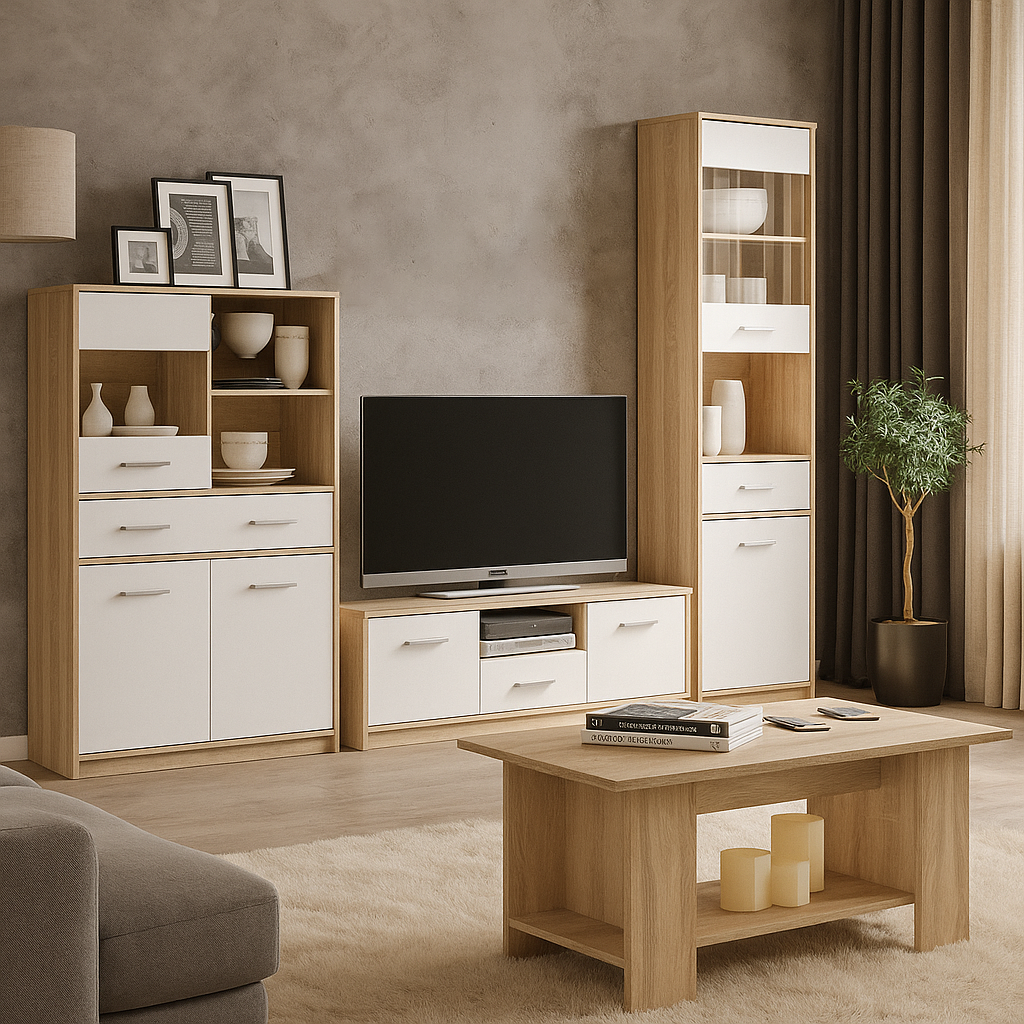 Відправка з 28 листопада 2025Модульний світлий комплект меблів у вітальню Тіпс, шириною 257 см і глибиною 38 см. У комплект входять ТВ-тумба з шухлядою і полицями, висока і низька вітрина з відкритими і закритими полицями і шухлядами, а також навісна полиця. Виготовляються з ДСП класу Е1, у двох варіантах кольорів: корпус дуб сонома з білими фасадами, або корпус і фасади дуб сонома. Меблі Тіпс модульні, ви можете підібрати відповідний комплект для вітальні в скандинавському стилі.