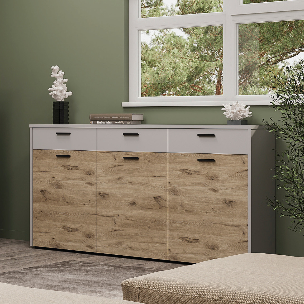 Відправка з 28 листопада 2025Стильний великий комод 3Д3Ш Стоун, шириною 170 см і глибиною 37 см. Містить: три шухляди і три тумби з полицями всередині. Виготовляється з ламінованого ДСП класу Е1 (не містить шкідливих для людини клеїв і смол), у комбінації кольорів: шиншила сіра і дуб вікінг. Належить до модульних меблів у вітальню Стоун, що дає можливість підібрати комплект для вашої кімнати. Меблі Стоун сірого відтінку зі вставками, що імітують дерево в кольорі дуб вікінг, стануть невід'ємним акцентом у вашому інтер'єрі. Поєднання сірого і натуральної деревини створює гармонійний контраст, додаючи простору вишуканості та стилю.