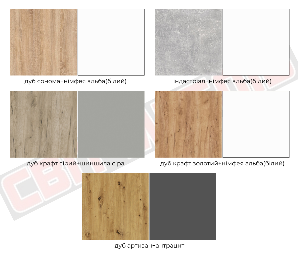 | Колір (відтінок) меблів | Білий, Дуб сонома, Сірий, Дуб крафт золотий, Бетон, Бетон + білий , Дуб артизан, Антрацит |