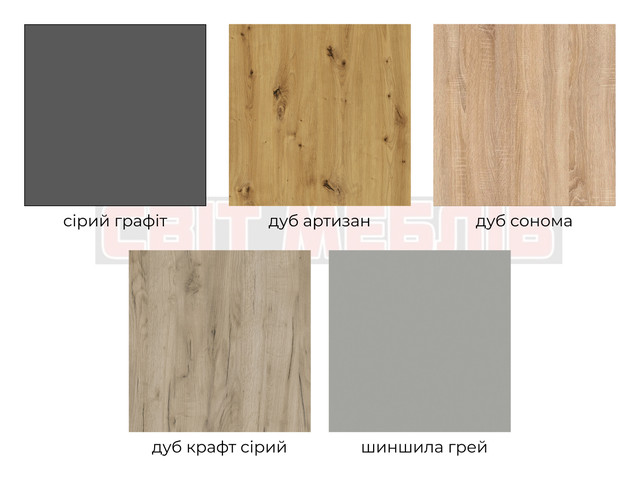 | Колір (відтінок) меблів | Дуб крафт сірий, Сірий, Дуб сонома, Дуб артезіан |