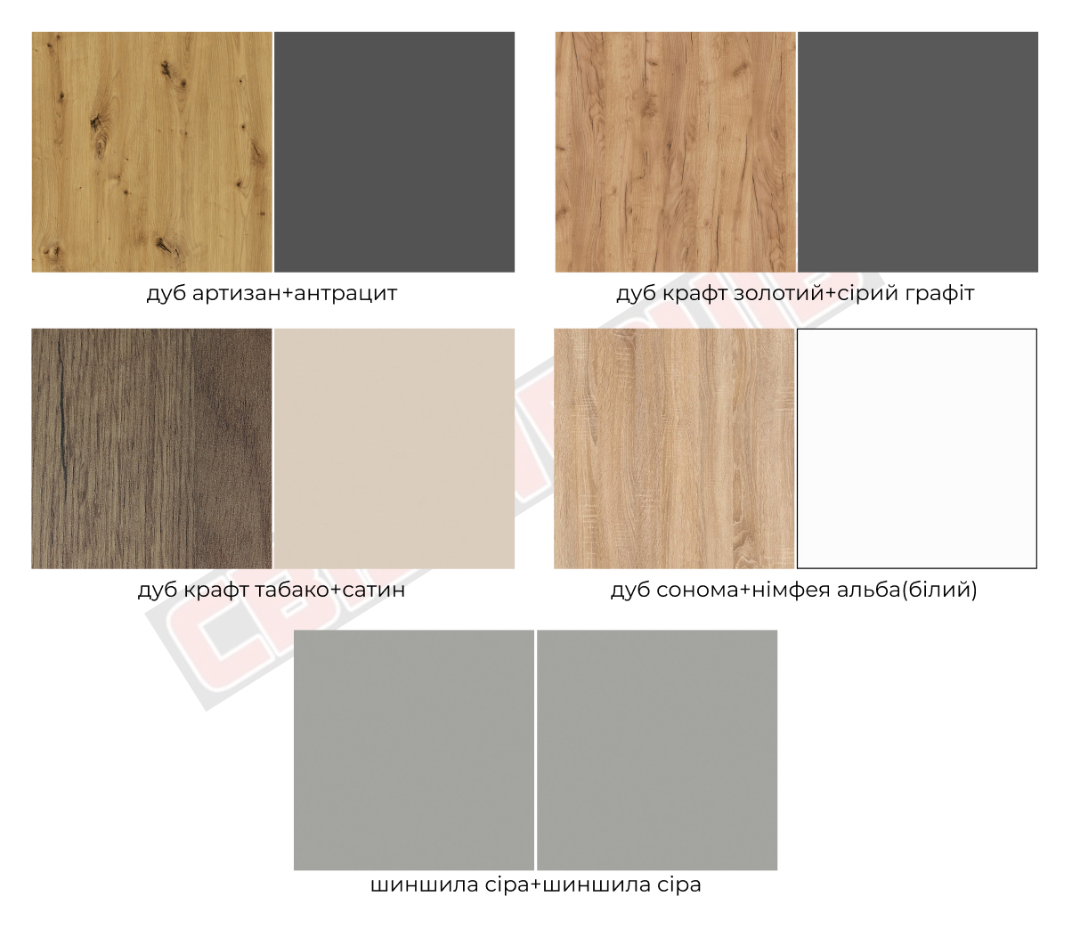 | Колір (відтінок) меблів | Дуб артисан, Дуб сонома + білий, Дуб сонома, Дуб крафт золотий, Білий, Сірий |