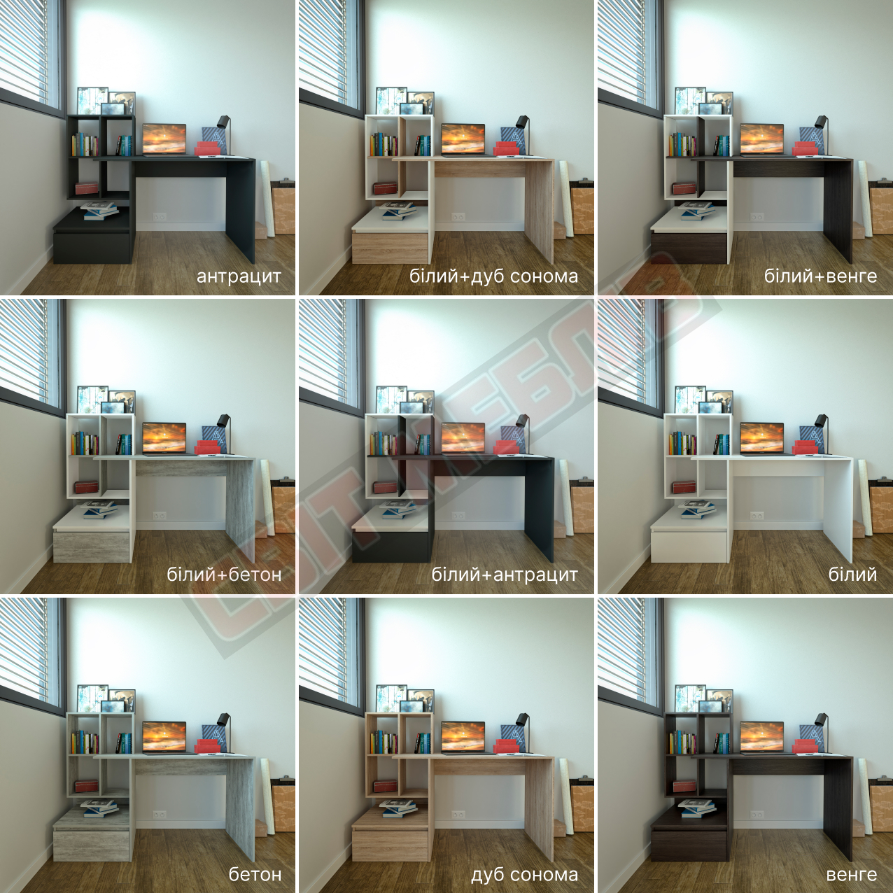 | Колір (відтінок) меблів | Антрацит, Білий, Білий + дуб сонома, Бетон, Бетон + білий , Венге, Венге темний + білий, Дуб венге, Дуб сонома, Дуб сонома + білий, Сірий, Урбан Лайт |