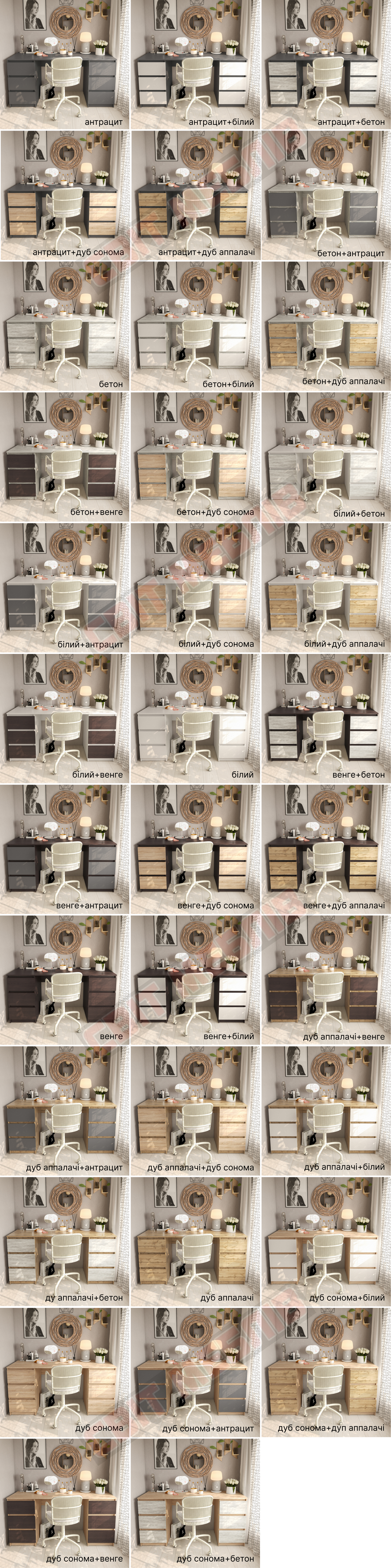 | Колір (відтінок) меблів | Антрацит, Білий, Білий + дуб сонома, Бетон, Бетон + білий , Венге, Венге темний + білий, Дуб венге, Дуб сонома, Дуб сонома + білий, Сірий, Урбан Лайт |