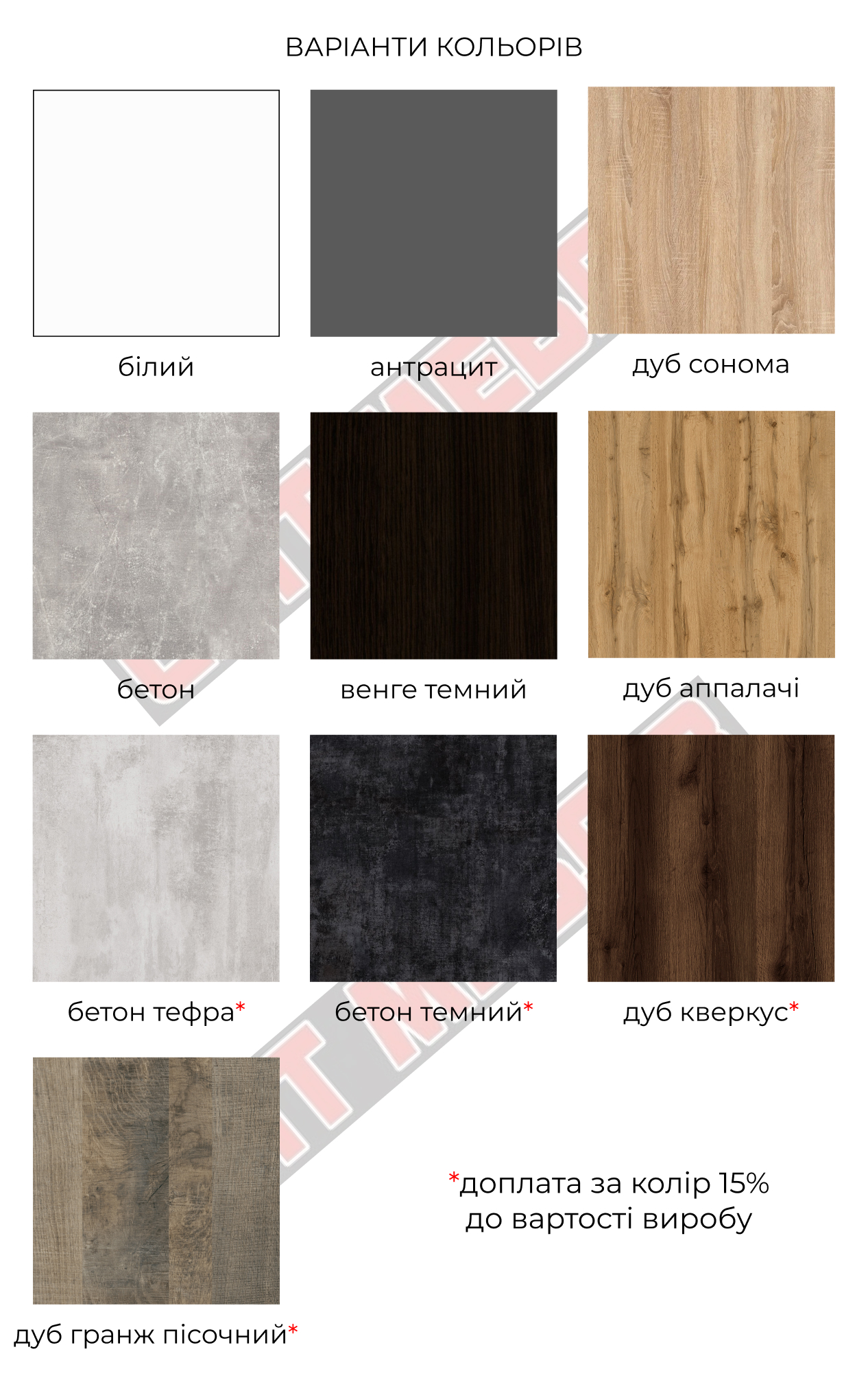 | Колір (відтінок) меблів | Антрацит, Білий, Білий + дуб сонома, Бетон, Бетон + білий , Венге, Венге темний + білий, Дуб венге, Дуб сонома, Дуб сонома + білий, Сірий, Урбан Лайт |