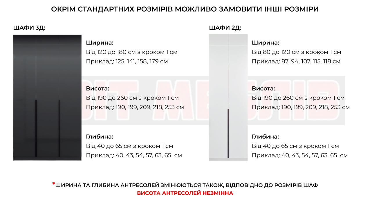 Шафа доступна в декількох варіантах ширини - 80, 90, 100, 110 або 120 см, а також у двох варіантах висоти - 250 см і 260 см, що дає змогу вибрати оптимальний варіант для будь-якого приміщення. Ідеальне рішення для тих, хто шукає шафу для верхнього одягу з антресоллю, що поєднує стиль і функціональність.