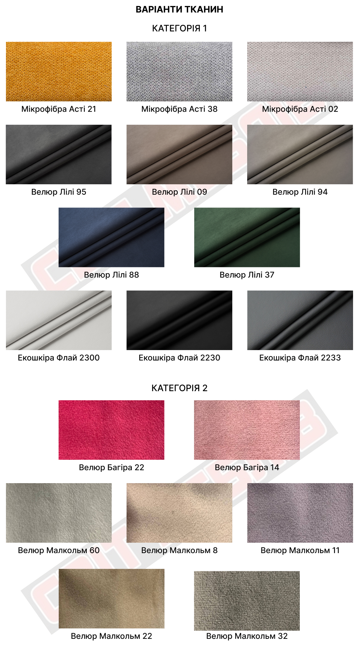 Передбачено широкий вибір варіантів оббивки: сірий, бежевий, жовтий, рожевий, коричневий, сіро-зелений та інші (всі зразки тканин представлені нижче). Завдяки різноманітності кольорів ліжко легко впишеться в інтер'єр як хлоп'ячої, так і дівочої кімнати. Будучи частиною модульної системи Краш, модель добре поєднується з іншими елементами серії, даючи змогу раціонально використовувати простір і створити зручну обстановку з урахуванням віку і потреб дитини.