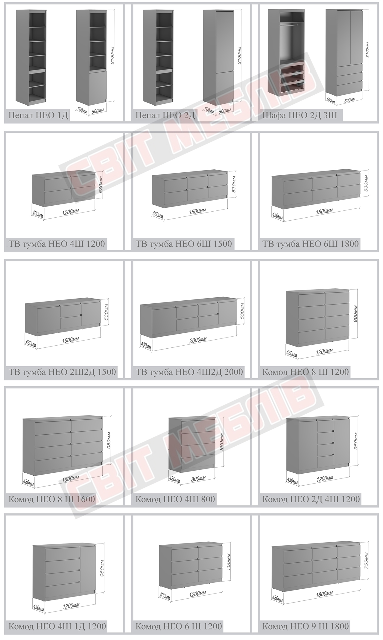 Виготовляється з екологічно чистого ЛДСП товщиною 16 мм, без вмісту шкідливих смол і клеїв. Доступно 10 варіантів кольору (див. фото нижче), які пасуватимуть до різних інтер'єрів. Є частиною модульної системи Нео, що дає змогу легко поєднувати його з іншими елементами та обирати потрібну конфігурацію для вітальні.
