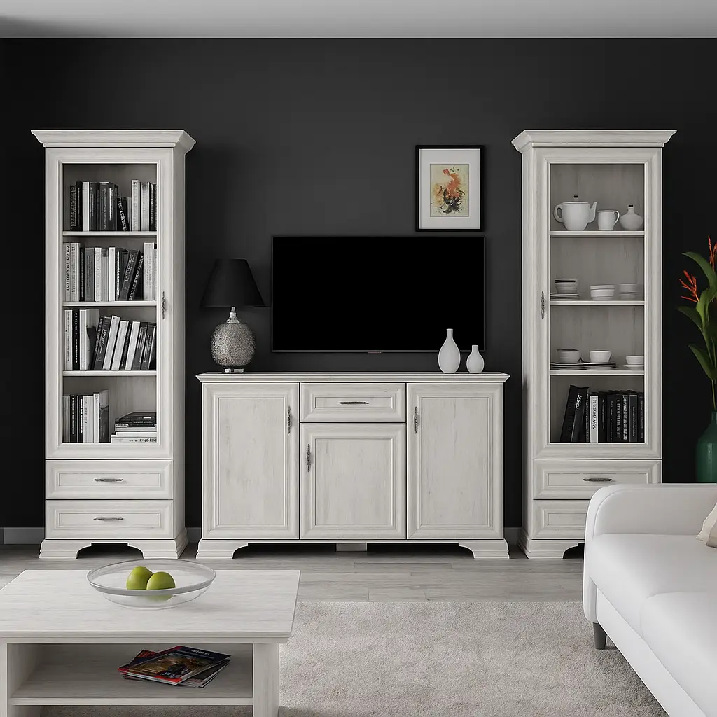 Комплект меблів у вітальню в стилі сучасна класика Іріс. Вітальня складається з двох вітрин, кожна з яких оснащена полицями з ЛДСП і двома шухлядами, а також комода з шухлядою і трьома закритими секціями. Виготовляється з ламінованого ДСП класу Е1, у двох варіантах: комбінація дуб золотий і андерсон пайн або однотонний варіант - андерсон пайн (білий зі структурою деревини). Направляючі шухляд - телескопічні, повного висуву. Система Іріс складається з 21 модуля, що дає можливість підібрати відповідний комплект для вашої вітальні або спальні. Меблі Іріс пасують до інтер'єрів у стилі прованс або сучасна класика. За рахунок білого кольору не перевантажують простір.