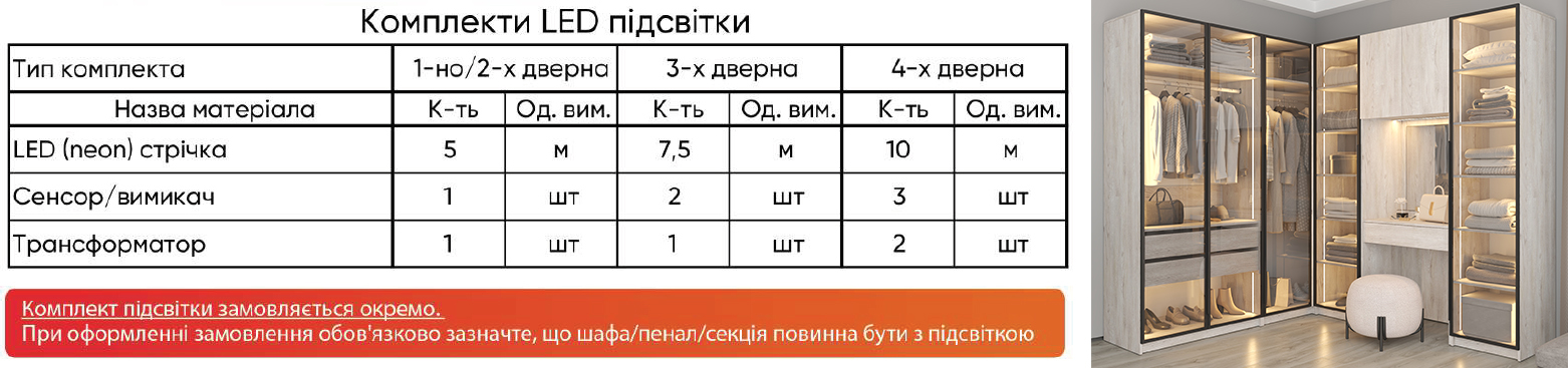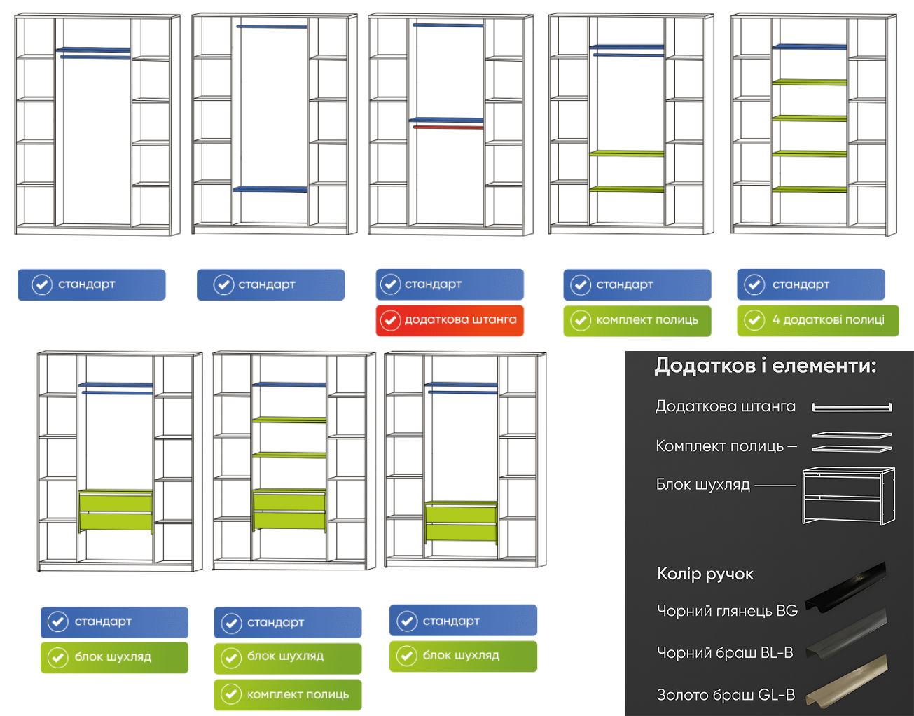 Усередині передбачена базова комплектація: штанга для одягу і полиці для зберігання білизни або аксесуарів. За бажання її можна змінити, додавши шухляди, додаткові полиці або ще одну штангу, щоб організувати простір на свій смак.