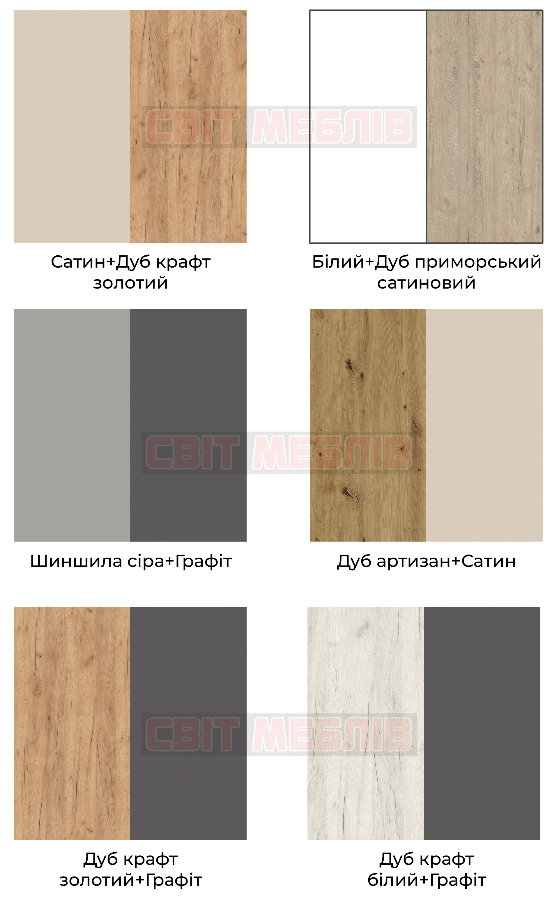 | Колір (відтінок) меблів | Дуб крафт золотий, Сатин, Дуб Крафт Білий, Шиншила сіра, Графіт, Білий |