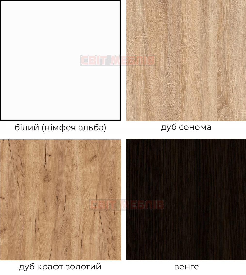 | Колір (відтінок) меблів | Дуб крафт золотий, Дуб сонома, Білий, Венге |