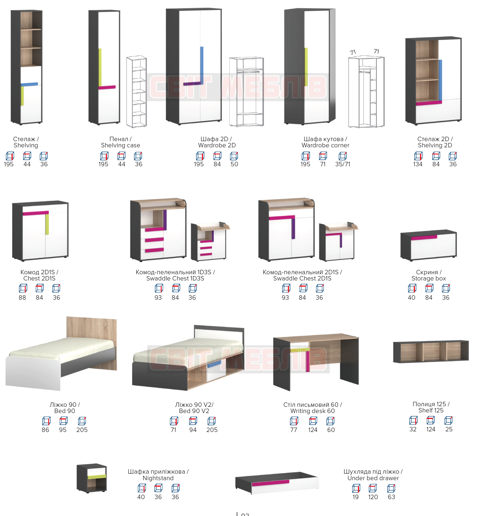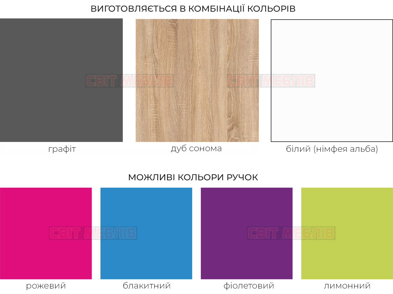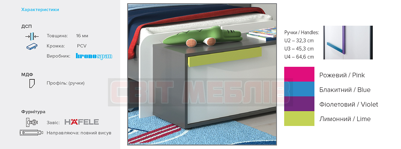 Виконаний із ламінованої ДСП товщиною 16 мм у поєднанні трьох кольорів: графіт, дуб сонома та білий. Спокійні природні відтінки створюють затишну атмосферу і не перевантажують простір. Цікаві ручки підкреслюють унікальність оформлення. Доступні чотири варіанти кольору: рожевий, блакитний, фіолетовий і лимонний. Можна вибрати ручки одного кольору або скомбінувати різні відтінки. Вони виконані з МДФ.