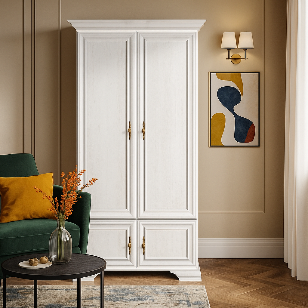 Красива біла розпашна шафа 2Д Іріс у стилі сучасна класика, шириною 100 см. Складається з секції зі штангою для вішалок з одягом і закритої тумби. Виготовляється з ламінованого ДСП класу Е1, у двох варіантах: комбінація дуб золотий і андерсон пайн або однотонний варіант - андерсон пайн (білий зі структурою деревини). Належить до модульної системи Іріс, яка складається з 21 елемента, що дає можливість підібрати відповідний комплект для вашої вітальні або спальні. Меблі Іріс пасують до інтер'єрів у стилі прованс або сучасна класика.