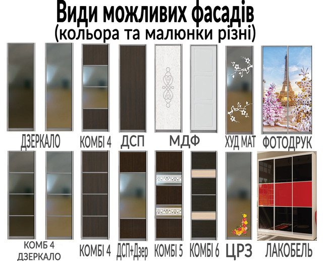 | Фасади | дзеркало, скло з малюнком, ламінована ДСП, Дзеркало з художнім матуванням |